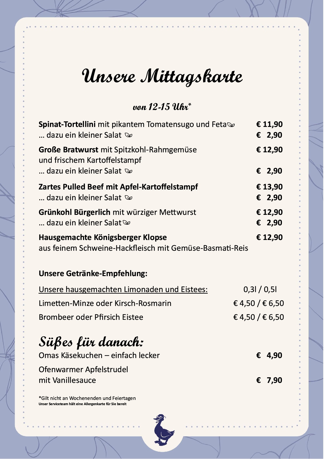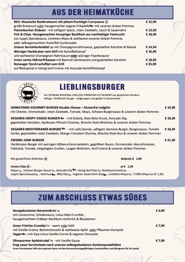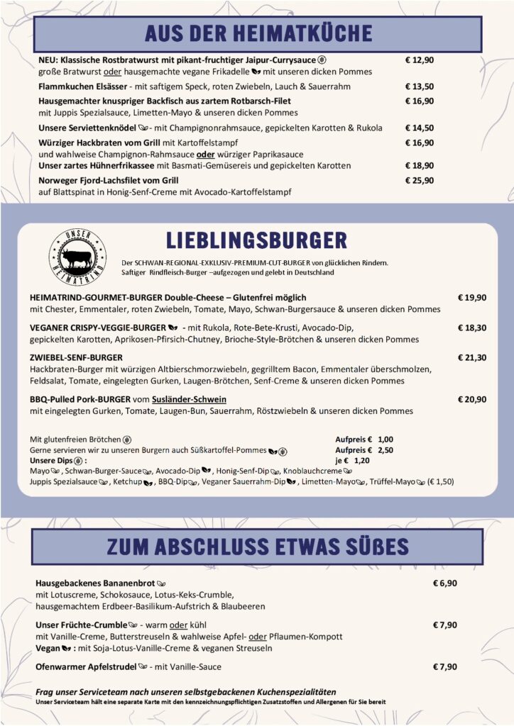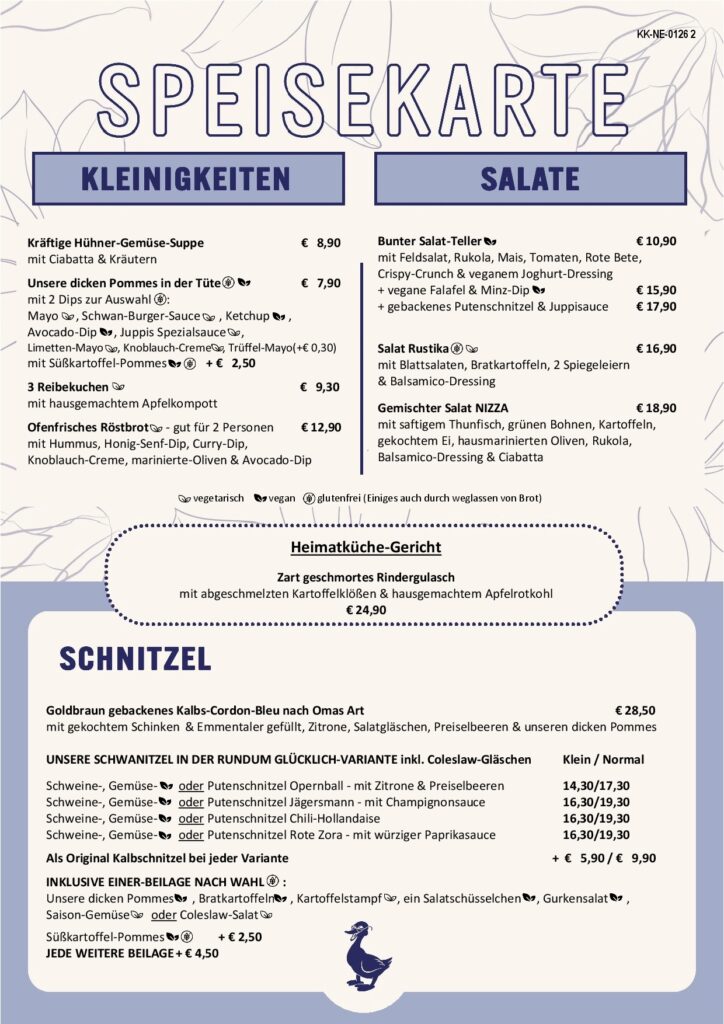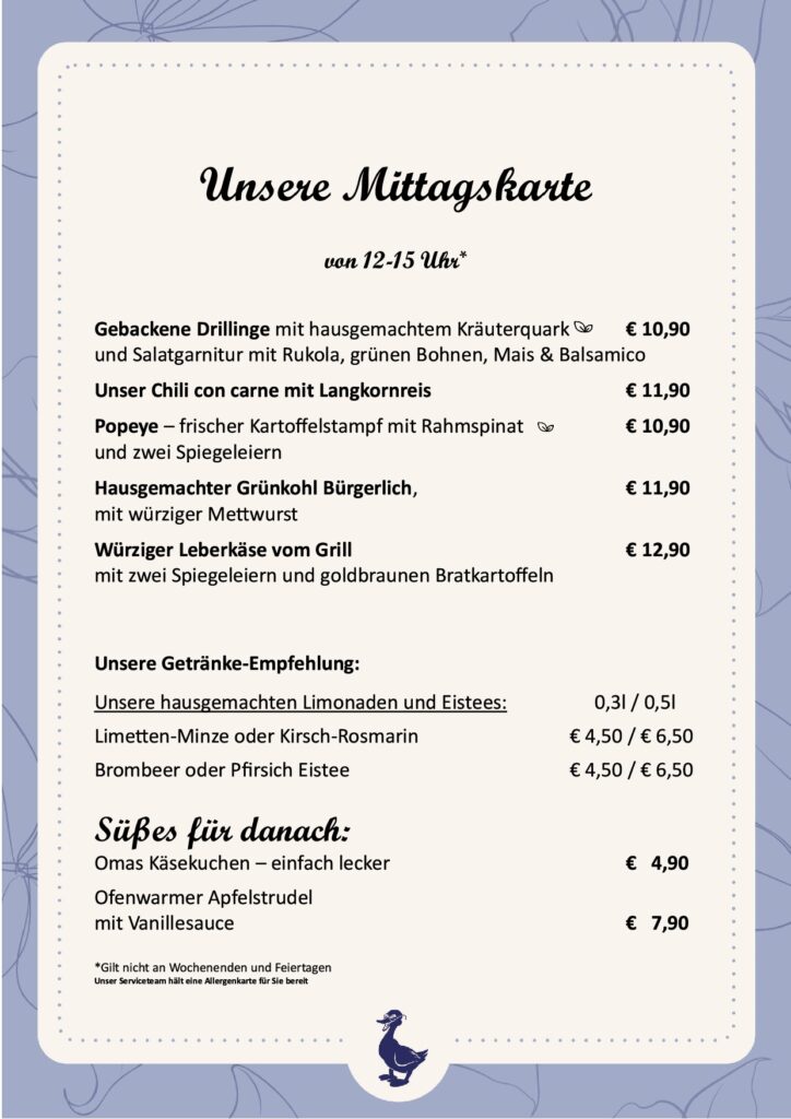 Alle Preise in Euro, inkl. gesetzlicher Mehrwertsteuer & Bedienung.