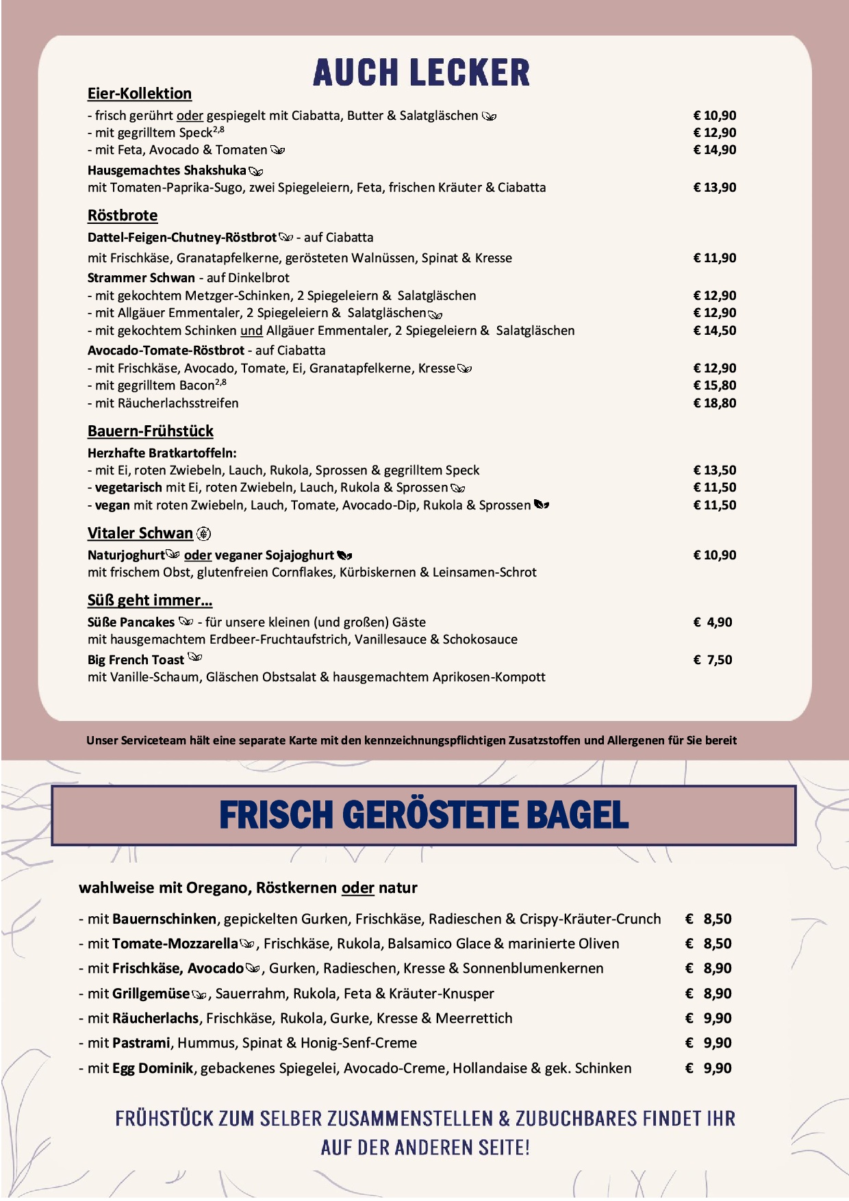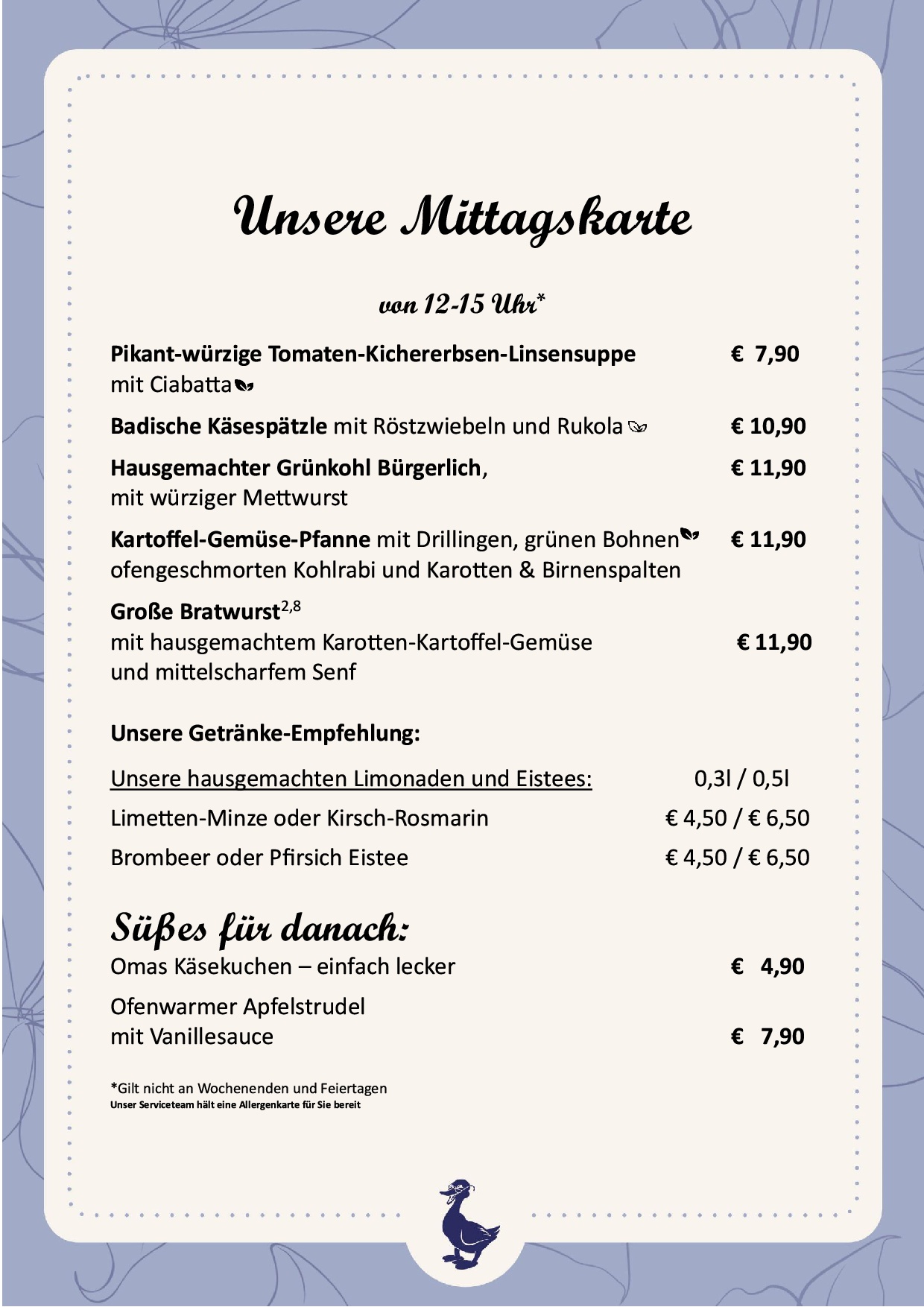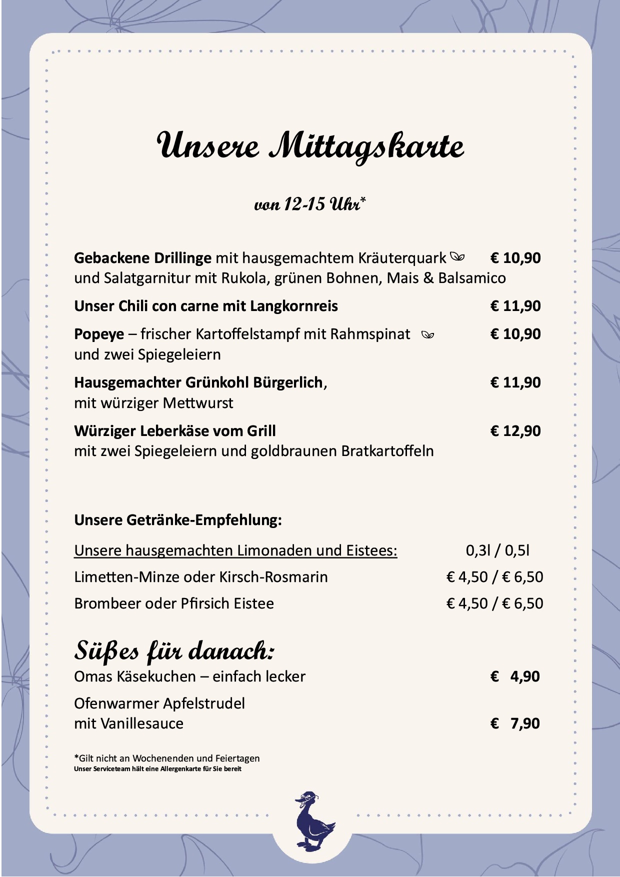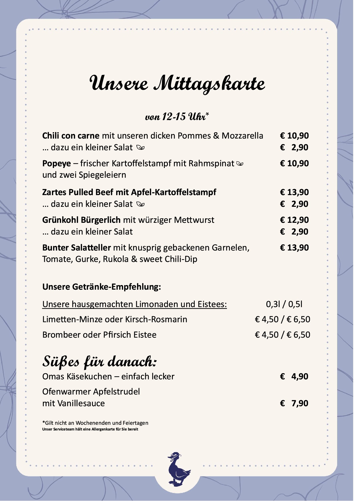 Alle Preise in Euro, inkl. gesetzlicher Mehrwertsteuer & Bedienung.