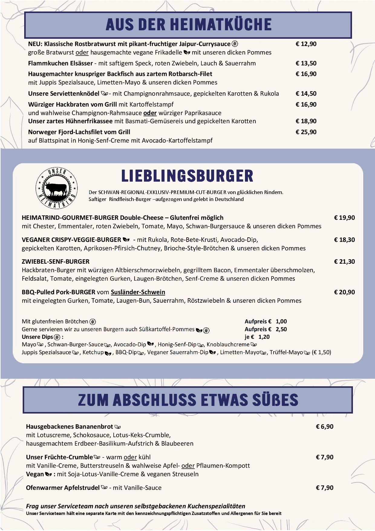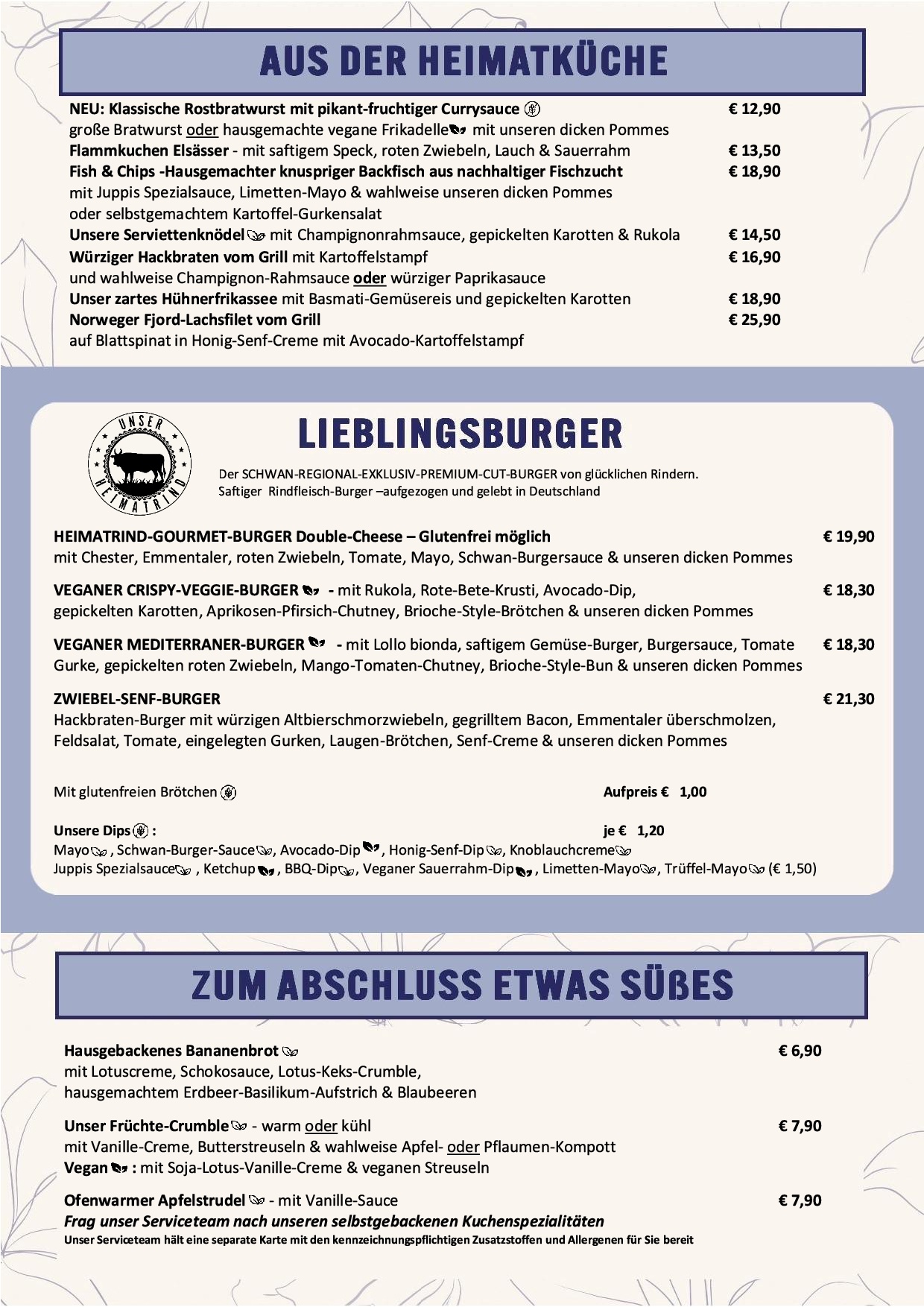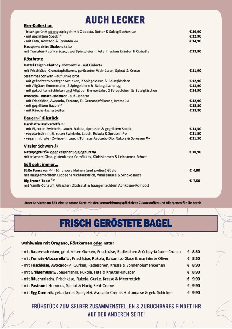 Zusatzstoffe & Allergene Liebe Gaste, trotz größtmöglicher Sorgfalt bei der Herstellung in unserer Küche, kann es produktionsbedingt nicht ausgeschlossen werden, dass Produkte auch Spuren der anderen genannten Allergene enthalten. Unser Serviceteam hält eine Allergenkarte mit allen Deklarationen für Euch bereit.