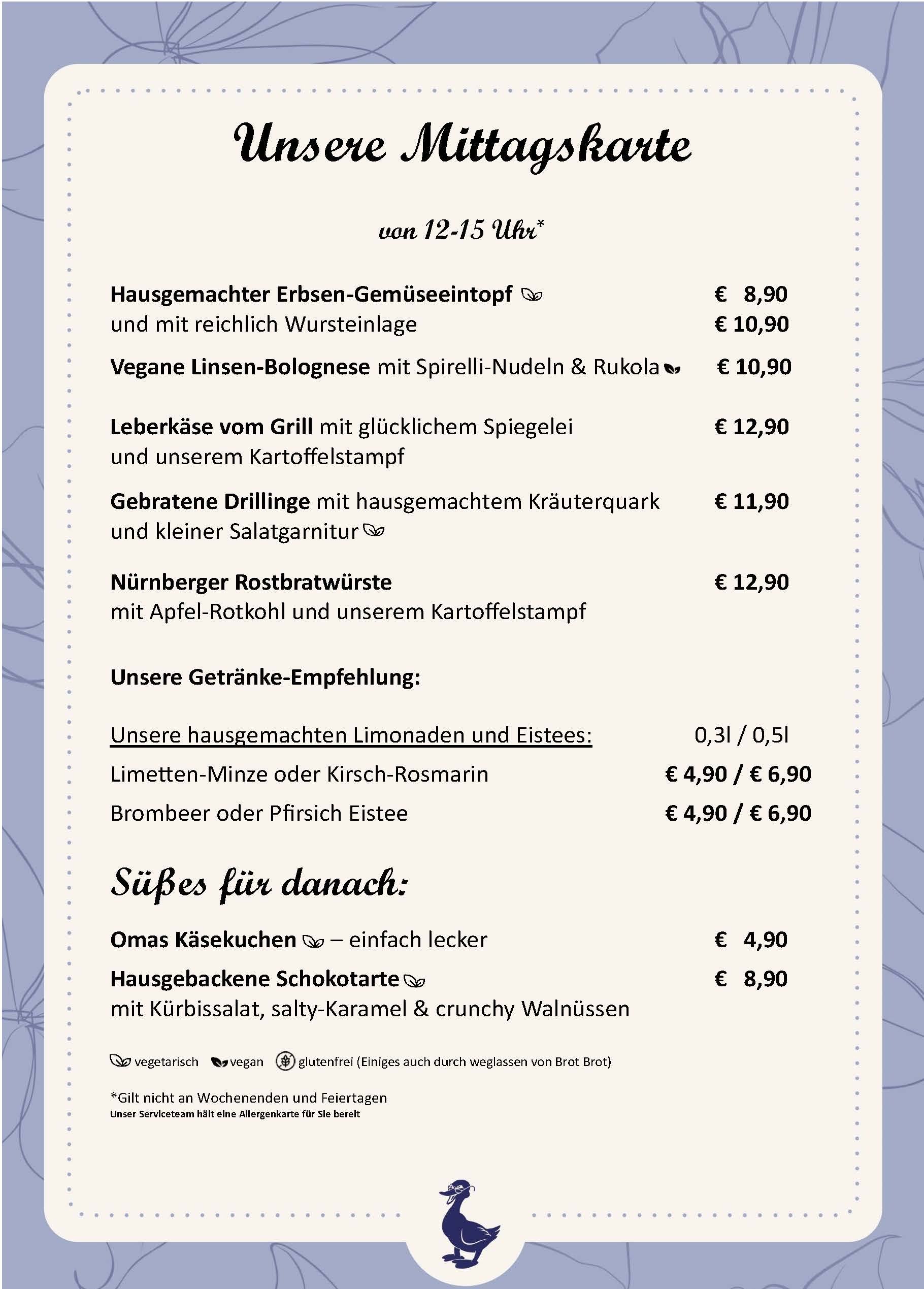 Alle Preise in Euro, inkl. gesetzlicher Mehrwertsteuer & Bedienung.