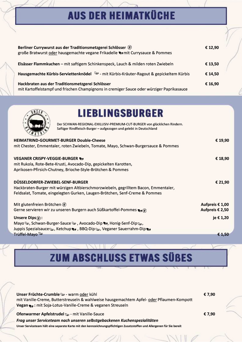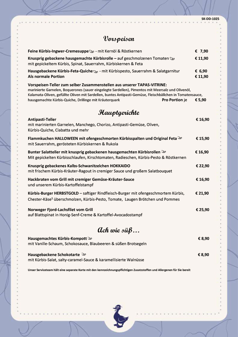 Alle Preise in Euro, inkl. gesetzlicher Mehrwertsteuer & Bedienung.