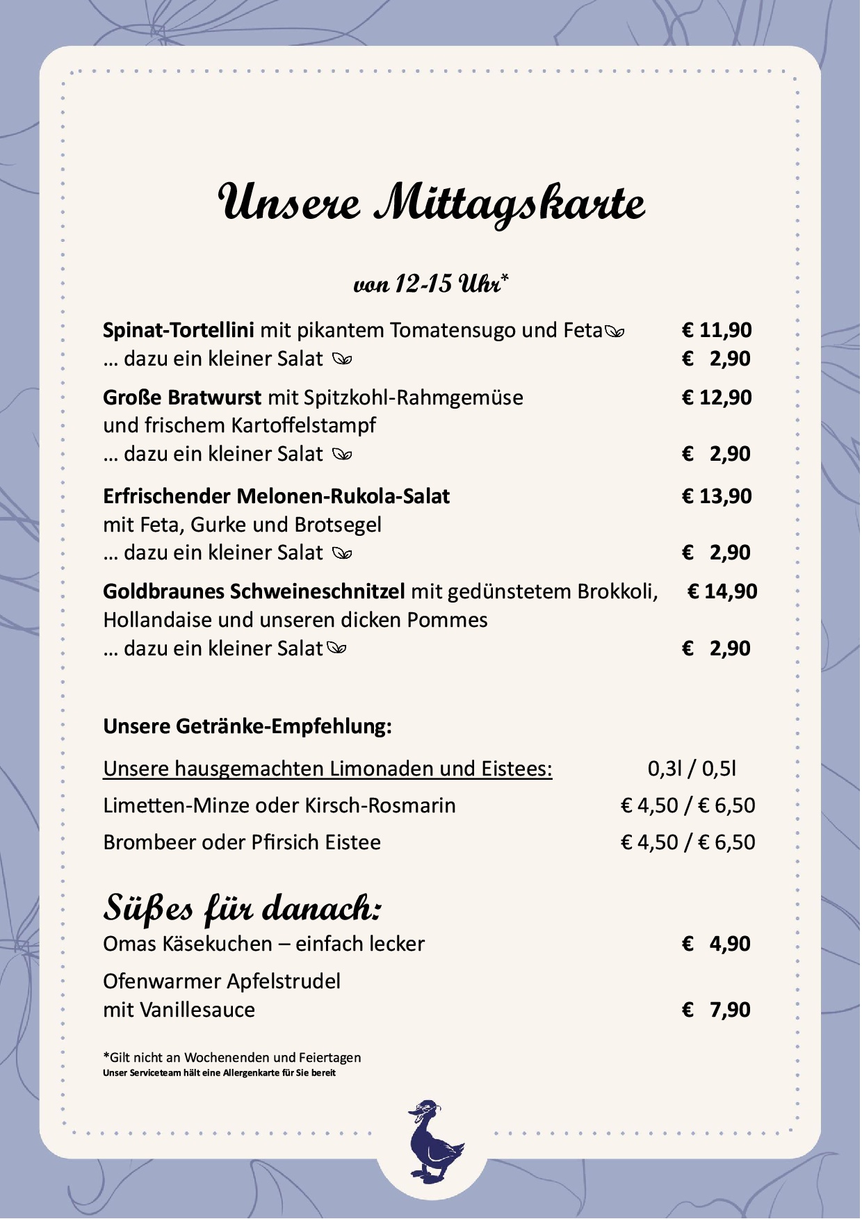 Alle Preise in Euro, inkl. gesetzlicher Mehrwertsteuer & Bedienung.